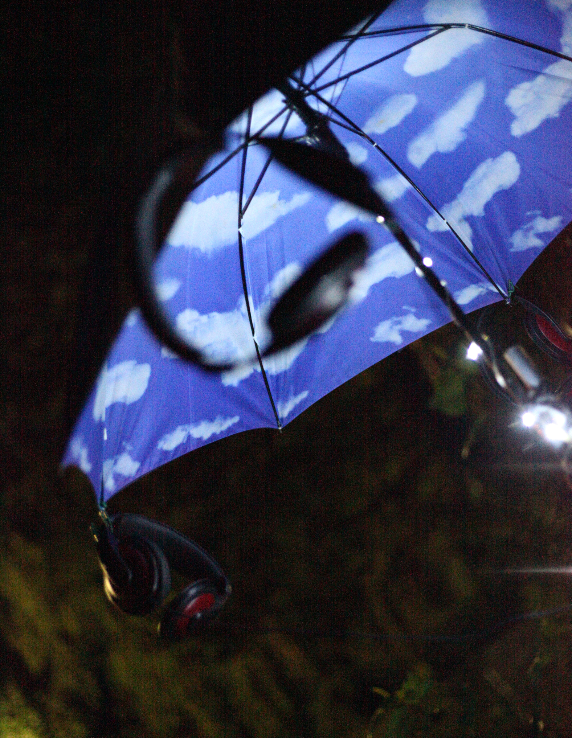 Le dispositif est composé d’un caisson mobile sur roulette poussé par une personne, relié à un vidéoprojecteur manipulé par une autre personne donnant ainsi vie à l’image et surplombé d’un parapluie auquel est suspendus des casques audios. Il permet ainsi de diffuser différents contenus dans l’espace public en déambulation.