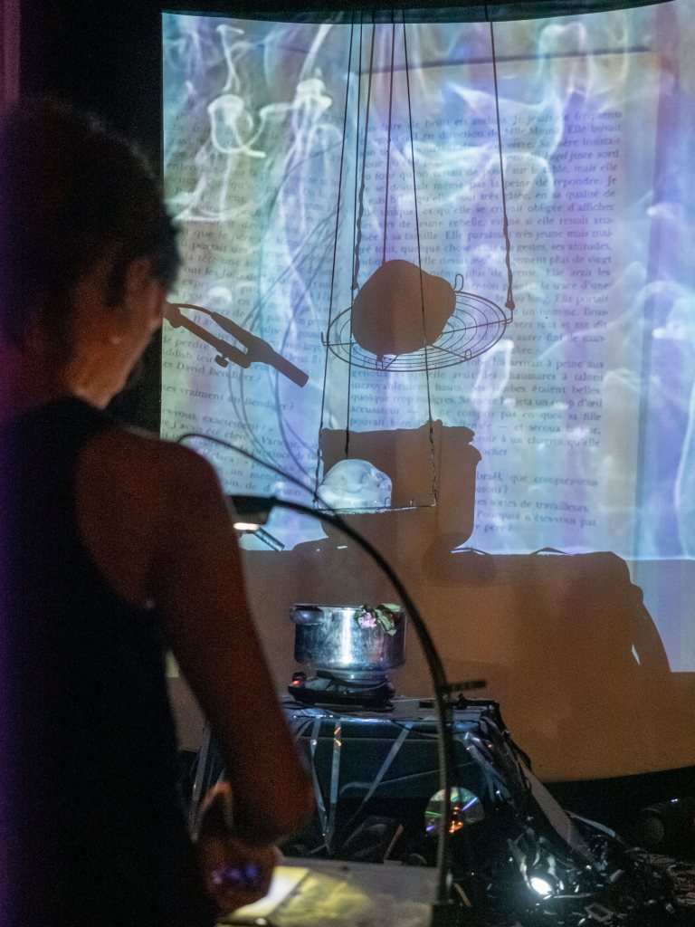 A l’image vidéoprojetée, des encres s’échappent continuellement de celle-ci, et des images créent en direct se superposent lors d’intervention performative, évoquant la vanité à travers le temps qui s’écoule, flux incessant, ce temps qui passe inexorablement et qui altère la matière sur son passage.